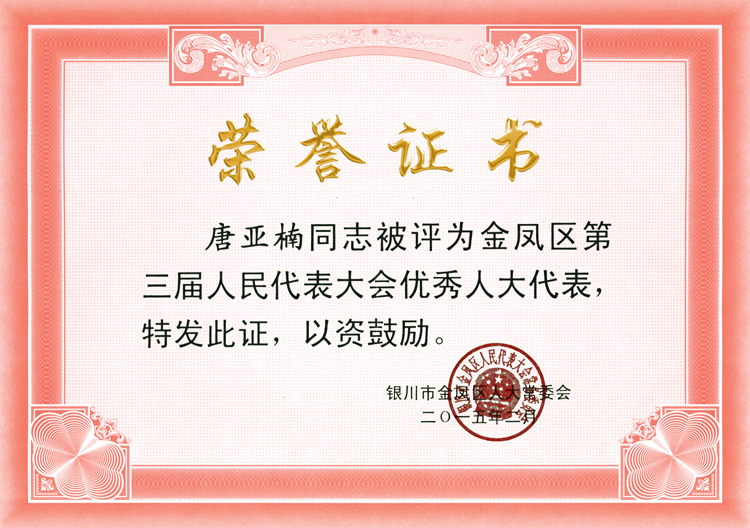 總經(jīng)理唐亞楠被評為金鳳區(qū)三屆人大優(yōu)秀代表