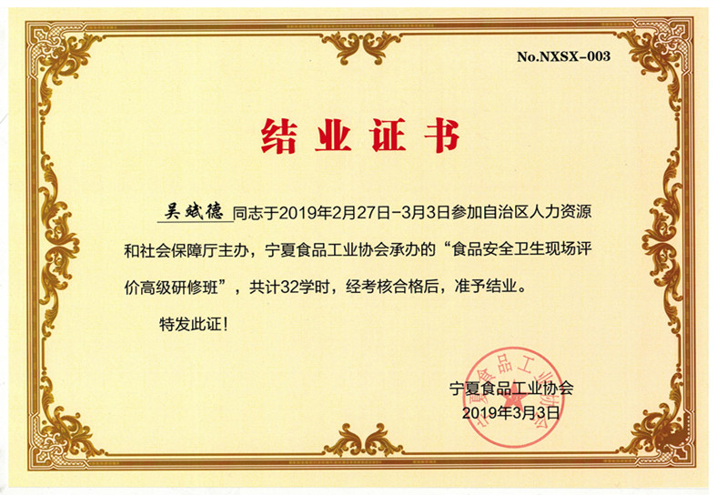 生產(chǎn)部經(jīng)理吳斌德參加“食品安全衛(wèi)生現(xiàn)場評價高級研修班“順利結(jié)業(yè)